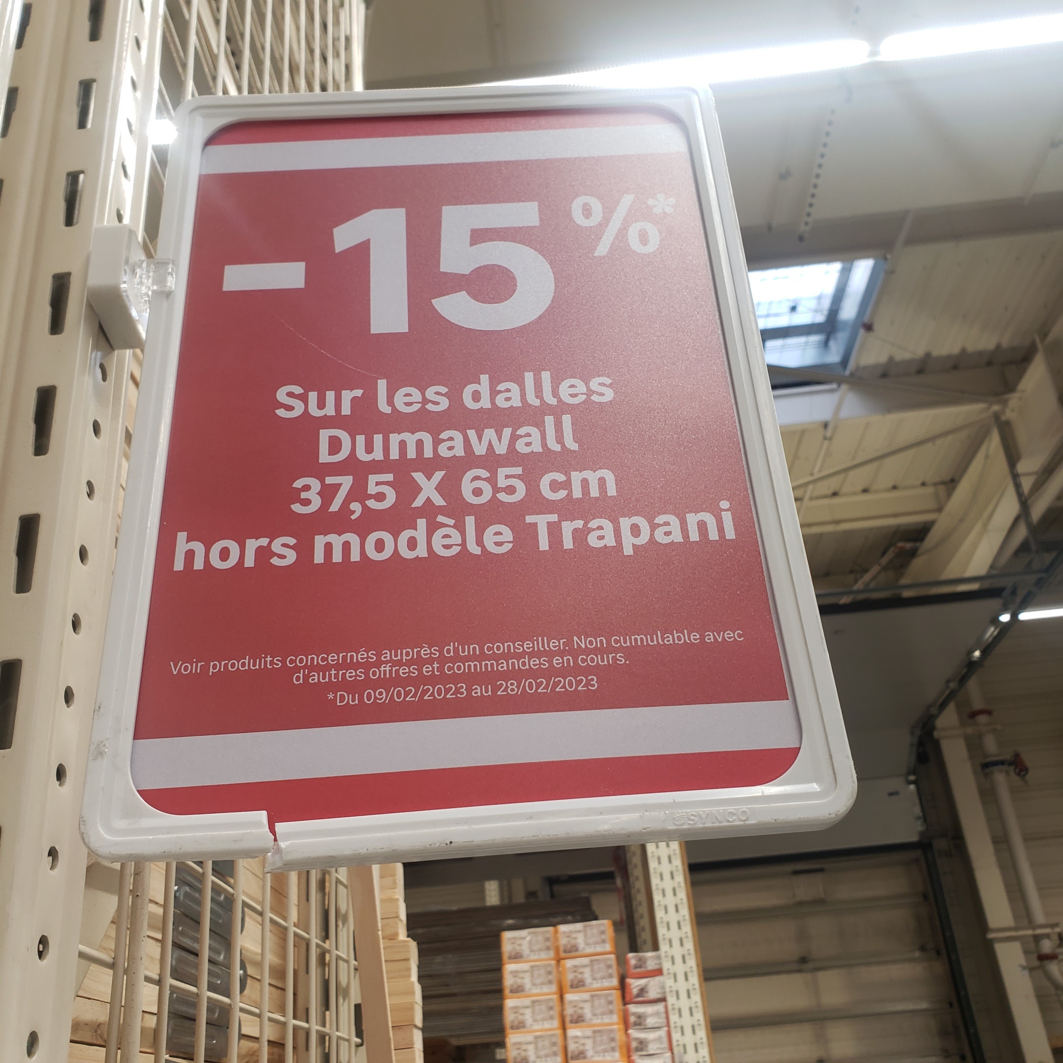 Jeudi 23 février, nous sommes allées acheter des dalles DUNAWALL modèle LARISSA blanches. Une promotion - 15% sur toutes les dalles sauf le modèle TRAPANI était affichée. Lors du passage en caisse, on nous dit que ce modèle n'est pas en promotion !! Le responsable du rayon confirme à la caissière. Bien évidemment, nous ne sommes pas d'accord avec cet agissement. Nous avons fait une photo de l'affichage de la promotion (voir pièce jointe). Si le modèle LARISSA n'était pas en promotion, il fallait l'indiquer au côté du modèle TRAPANI ou bien le mettre en rayon qu'après la promotion. Aussi, en rayon, il manquait 2 paquets du modèle LARISSA, nous voulions passer commande et là le conseiller stagiaire nous dit que pas possible parce qu''il y en a en stock magasin. Le responsable du rayon lui a dit que personne ne pouvant aller les chercher en réserve, qu'il nous dise de revenir le lendemain. Nous avons voulu nous entretenir avec le responsable, mais pas possible, car il était en conversation personnelle dans le rayon et faisait tout pour nous éviter sauf que nous entendions parfaitement sa conversation car nous étions de l'autre côté des baies coulissantes et porte de garage !! Après 20 bonnes minutes d'attente, une jeune femme du rayon, s'est débrouillée pour nous faire ramener la marchandise. Nous l'en remercions vivement. Concernant l'affichage de la promotion, je ne compte pas en rester là donc j'attends votre retour. Bien cordialement, Jean-Louis MERCIER