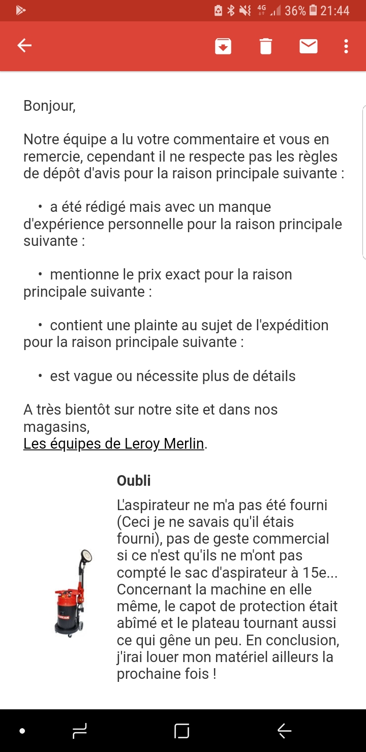 Bonjour Raphael, Je suis navré d’apprendre que votre passage en magasin et votre échange avec nos équipes n'aient pas répondu à vos attentes. Votre satisfaction étant notre priorité, n’hésitez pas à nous en dire davantage sur la situation évoquée à l’adresse suivante : [email protected] afin que nous puissions en échanger. Je vous souhaite une agréable journée. Au plaisir de vous revoir en magasin. Nicolas, service relation clients, Leroy Merlin Cesson