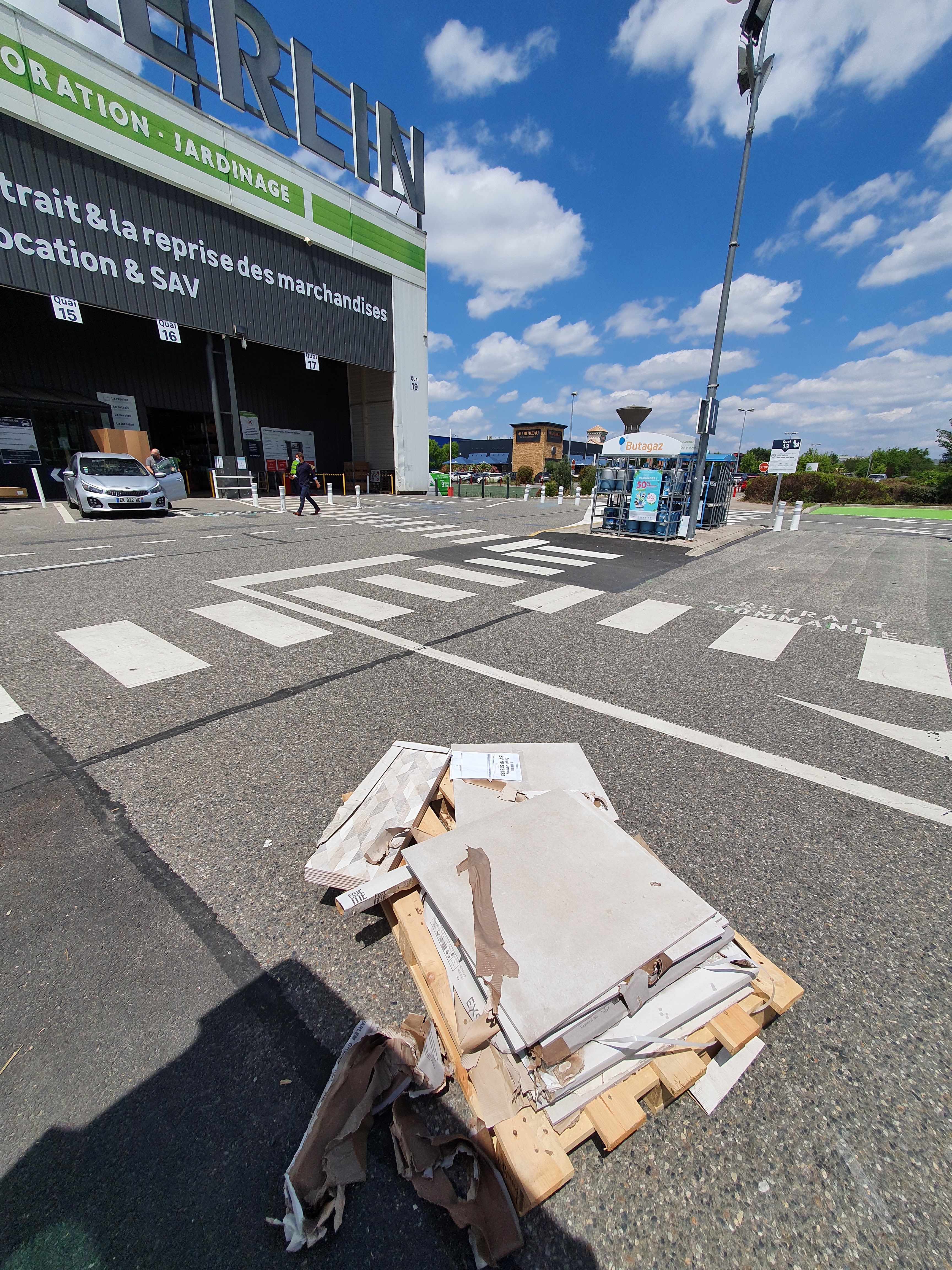Après 3h30 dans le magasin à faire mes 4 commandes ( ce poste n'est pas sur la lenteur du systèmeinformatique de leroymerlin) , en voici une en photo au retrait des commandes, embalage déchiré carrelage cassé, j'ai un peu peur pour le reste de ma commande en livraison. Évidement c'était à moi de trier le carrelage en bon état, en gros de préparer ma commande ! 😅