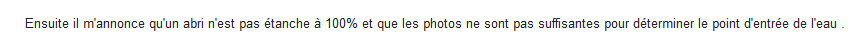 Honteux ! En avril 2023 nous achetons un abri de jardin Kerno, reférence 80118214 à Leroy Merlin Villeneuve d'Ascq. L'installation a eu lieu cet été après avoir traité le bois puis lasuré. L'abri de jardin est posé sur une dalle de 15 cm comme suggéré. Nous avons ajouté un bac acier pour assurer l'étanchéité de la toiture. 6 mois après, le bois est en train de pourrir car l'abri prend l'eau. Nous nous sommes donc rendus dans le magasin où avait eu lieu l'achat. Le vendeur indique que le bois présente un souci, qu'il n'était sûrement pas vendu sec. Il propose qu'on fasse un mail avec photos pour ouvrir un SAV auprès du fournisseur, chose que nous faisons. Le fournisseur a eu le culot de répondre qu'un abri de jardin n'est pas étanche à 100%, je vous laisse lire la photo de la réponse et surtout observer que l'abri n'est même pas étanche à 10%. Si un abri n'est pas étanche, à quoi sert il ? Nos voisins ont acheté un abri ailleurs et pourtant il ne prend pas l'eau. Le pire est que le responsable chez Leroy Merlin valide les dires du fournisseur. On pensait faire un bon achat sécurisé en passant par Leroy Merlin, cela remet en cause tout nos futurs achats. C'est une honte d'un tel magasin ! Un conseil, fuyez ! et n'achetez surtout pas ce produit ! Edit du 03/02/2024 : @Laurence : un certain Kévin, responsable de Renaud, devait nous appeler...on attend on attend ...depuis un trop long moment maintenant !!!!